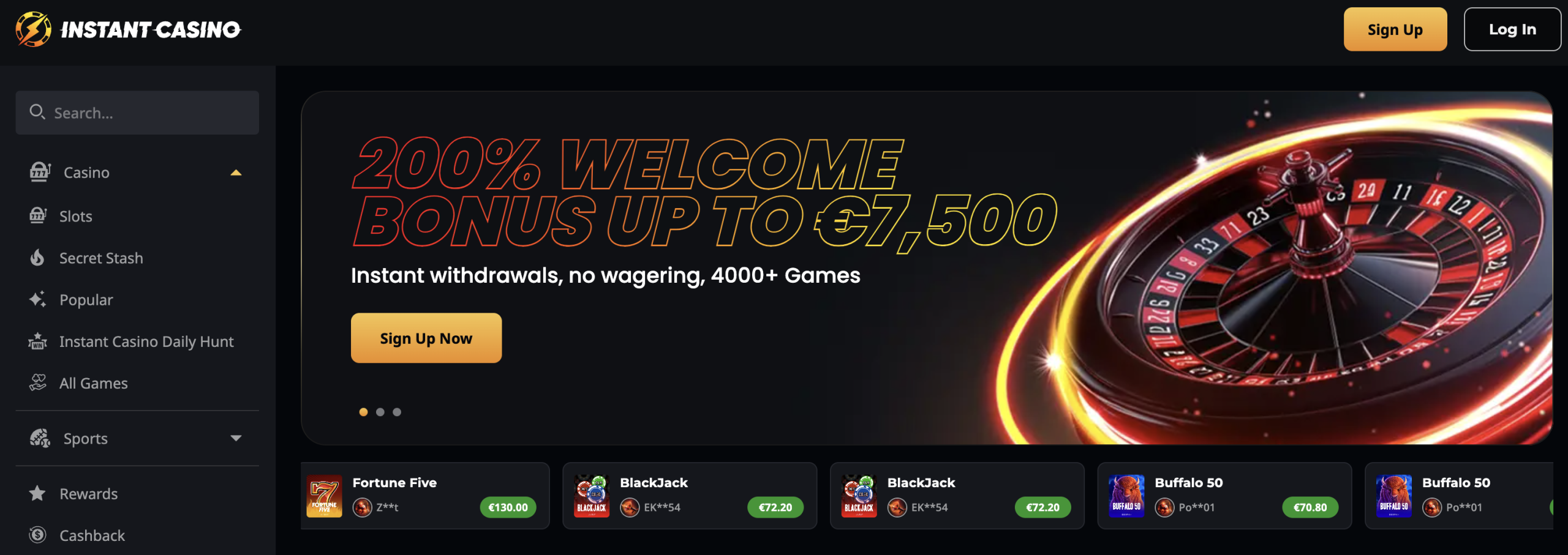 Instant Casino$7,500 (200% match) + 10% weekly cashbackStandard WR applies